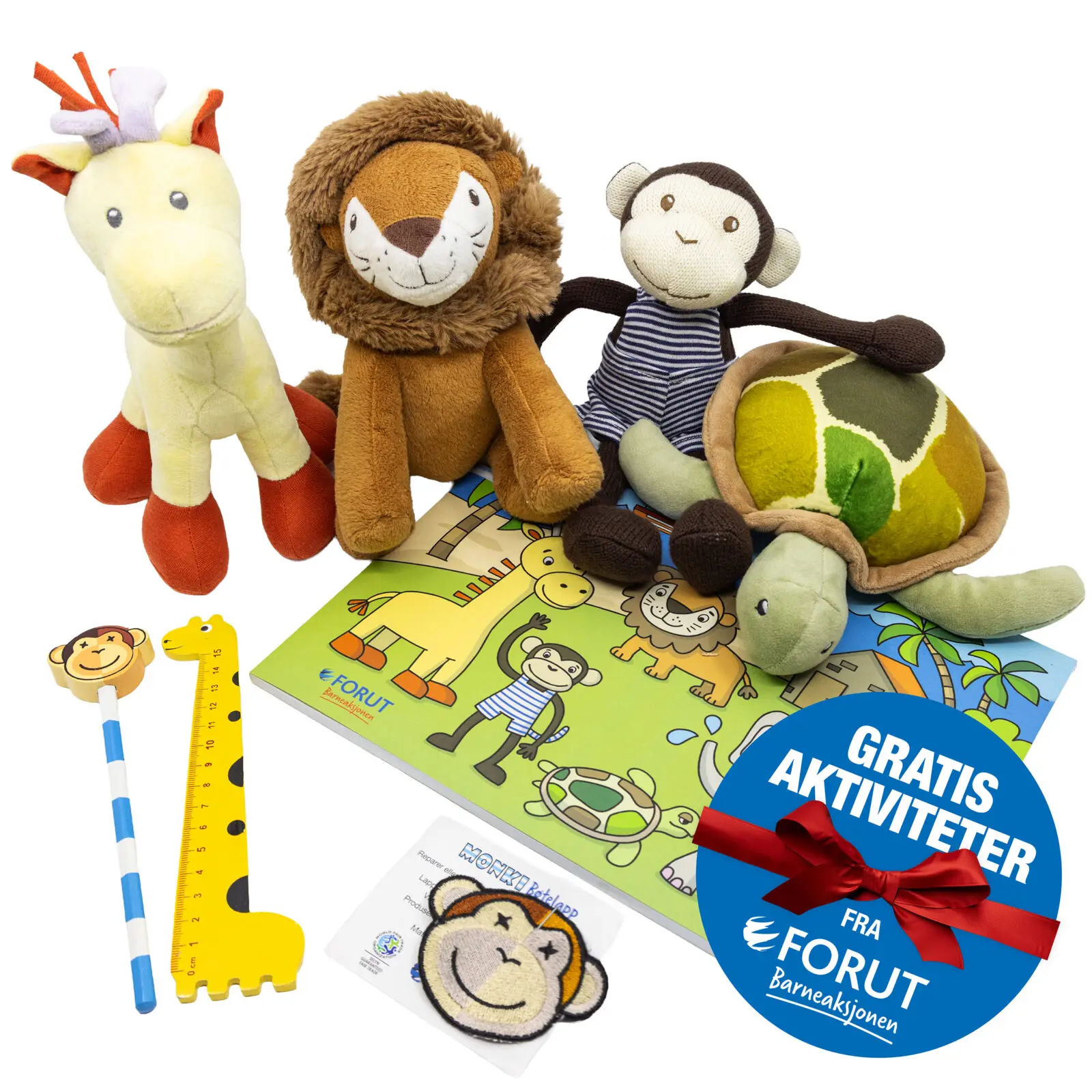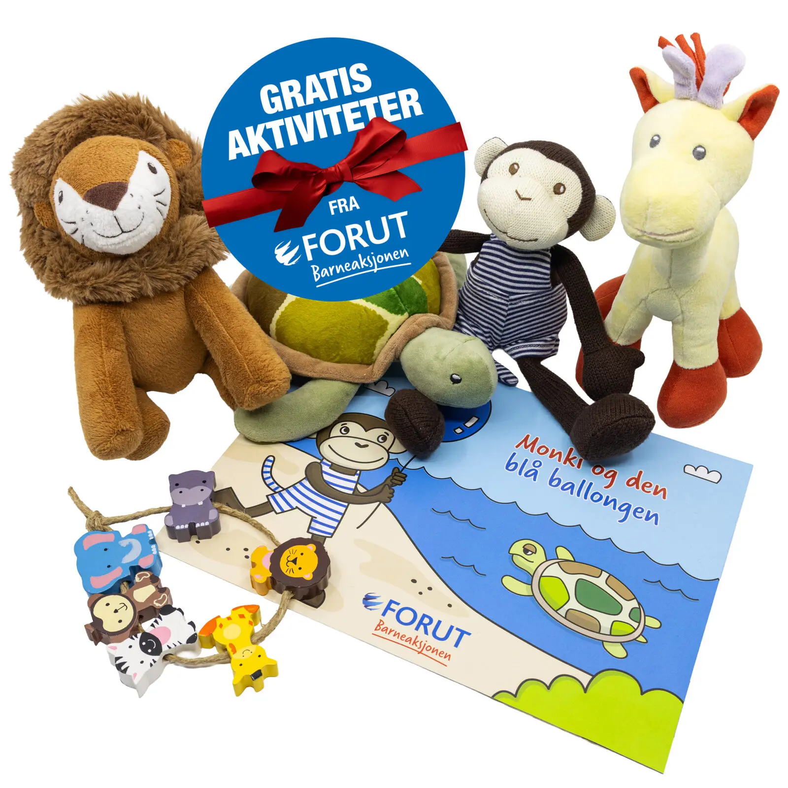 I pakkene finner dere blant annet et av våre populære kosedyr, som barna har et nært forhold til fra barnehagen gjennom FORUT Barneaksjonen.