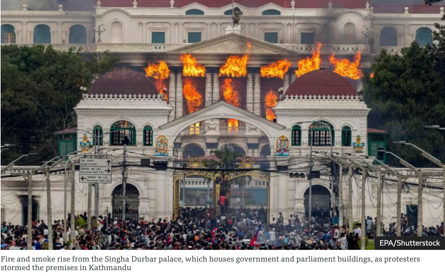 Parlamentsbygningen i flammer under opprøret. Faksimile fra BBC.